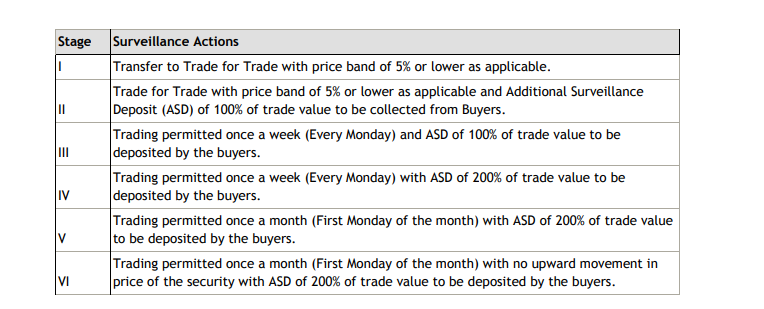 - Additional Surveillance Deposit (ASD): A 100% Additional Surveillance Deposit (ASD) of the trade value is mandated. This deposit is held by the exchange and may not be released until after a specific period, even after the stock is sold. This measure is intended to reduce volatility and discourage speculative trading in these securities.
